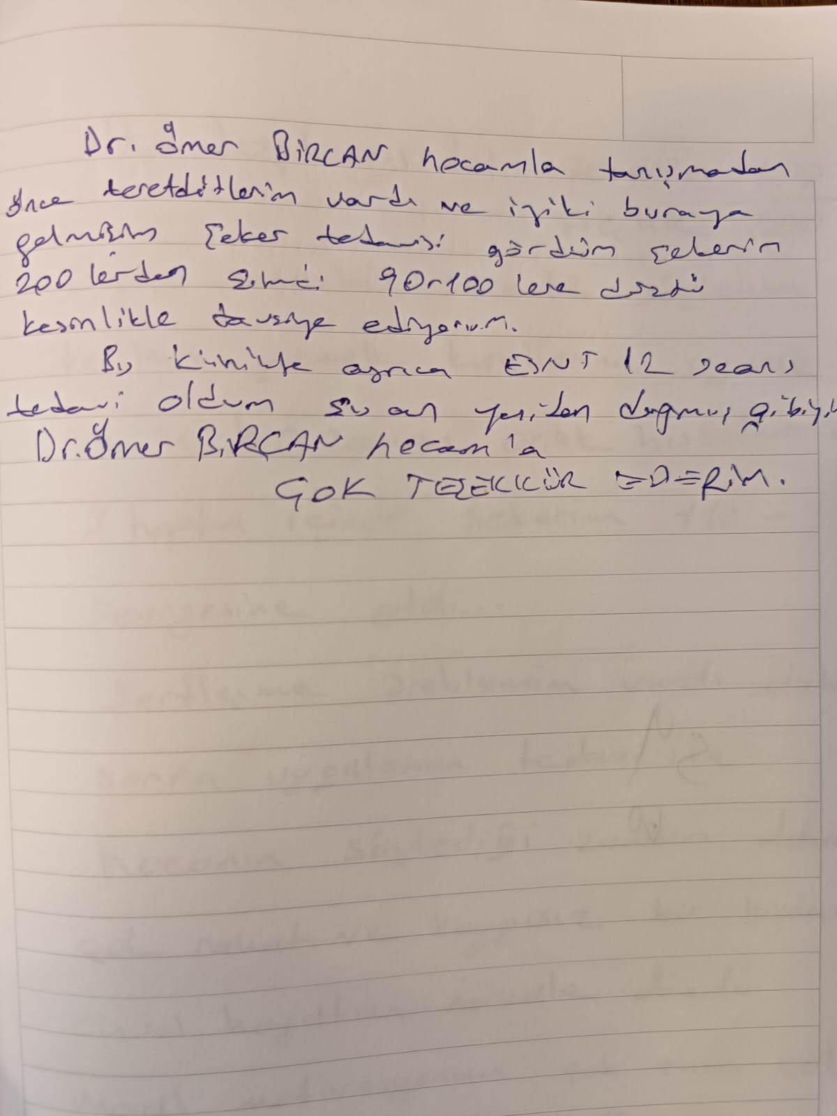 Dr. Ömer BİRCAN hocamla tanışmadan önce tereddütlerim vardı ve iyi ki buraya gelmişim Şeker tedavisi gördüm şekerim 200ler den şimdi 90 – 100lere düştü kesinlikle tavsiye ederim.