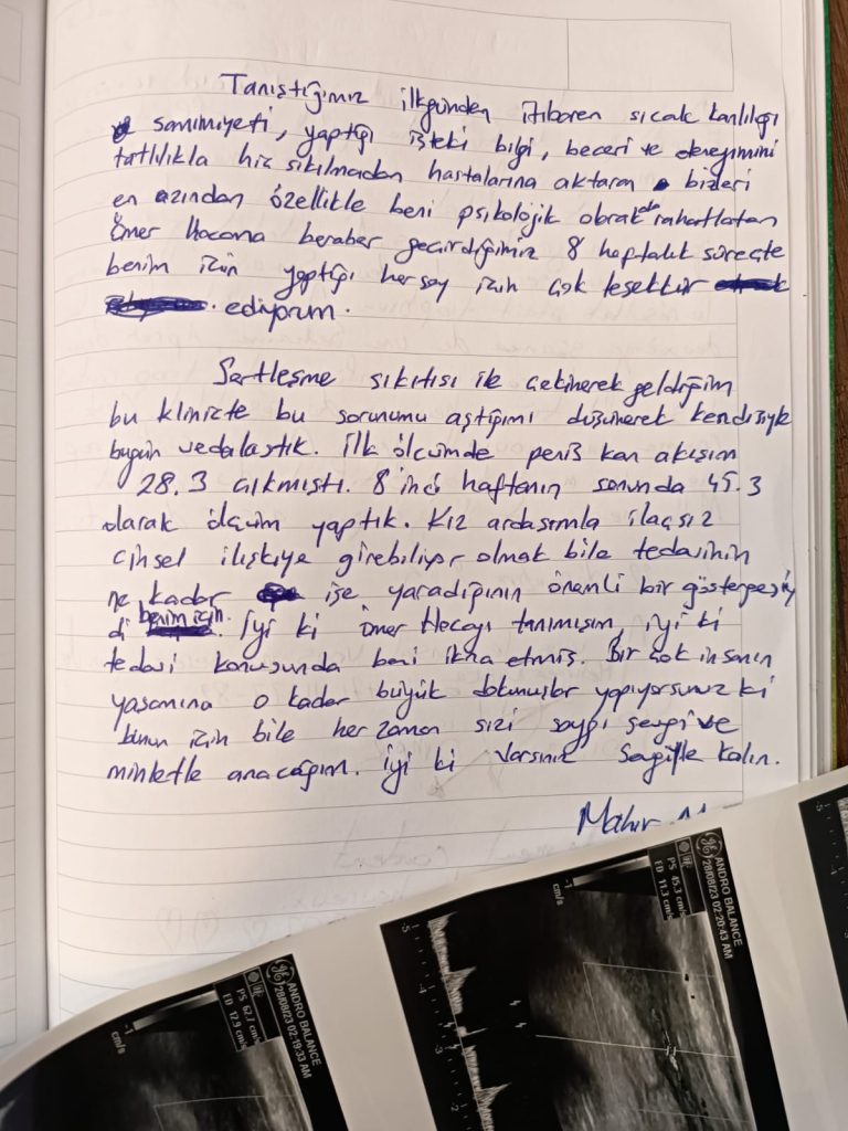 Sertleşme sıkıntısı ile çekinerek geldiğim bu klinikte bu sorunumu aştığımı düşünerek kendisiyle bugün vedalaştık. İlk ölçümde penil kan akımı 28.3 çıkmıştı. 8inci haftanın sonunda 45.3 olarak ölçüm yaptık. Kız arkadaşımla ilaçsız cinsel ilişkiye girebiliyor olmak bile tedavinin ne kadar işe yaradığının önemli bir göstergesiydi benim için. İyi ki Ömer Hocayı tanımışım iyi ki tedavi konusunda beni ikna etmiş. Birçok insanın yaşamına o kadar büyük dokunuşlar yapıyorsunuz ki bunun için bile her zaman sizi saygı ve sevgi ve minnetle anacağım. İyi ki varsınız sevgiyle kalın.