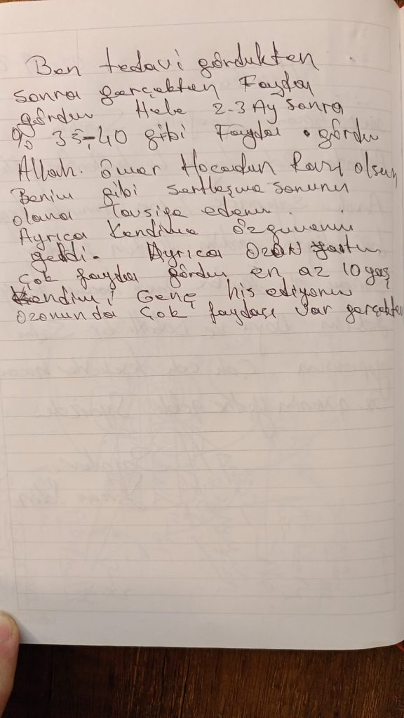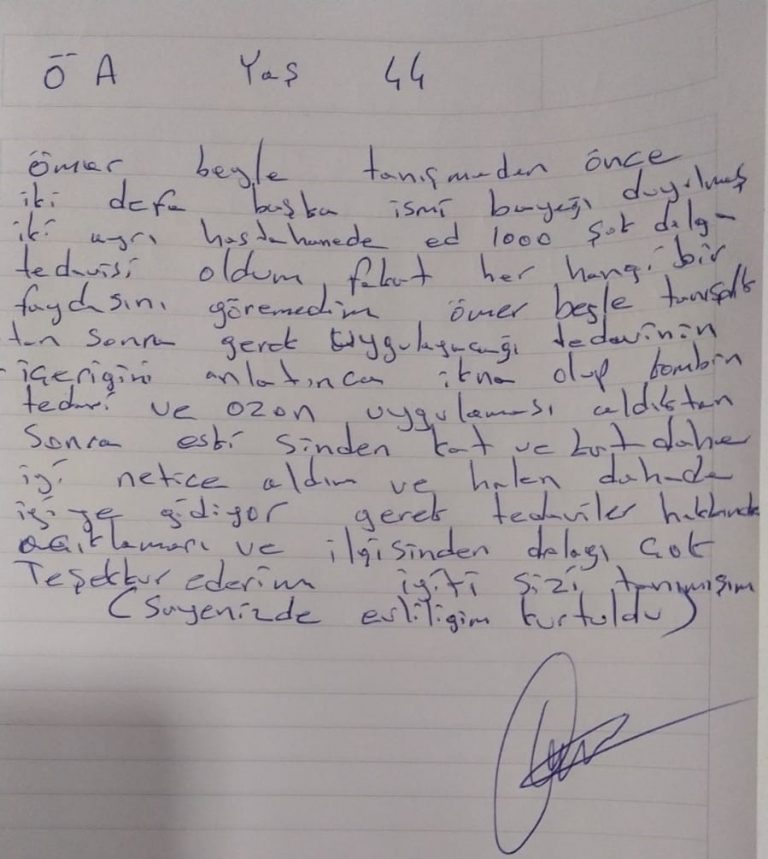 Ömer beyle tanışmadan önce iki defa başka ismi bayağı duyulmuş iki ayrı hastanede …….. şok dalga tedavisi oldum fakat her hangi bir faydasını göremedim ömer beyle tanıştıktan sonra gerek uygulayacağı tedavinin içeriğini anlatınca ikna olup tedavi ve ozon uygulaması aldıktan sonra eski sinden kat ve kat daha iyi netice aldım ve halen daha da iyiye gidiyor gerek tedaviler hakkında açıklamaları ve ilgisinden dolayı çok teşekkür ederim iyi ki sizi tanımışım ( sayenizde evliliğim kurtuldu)