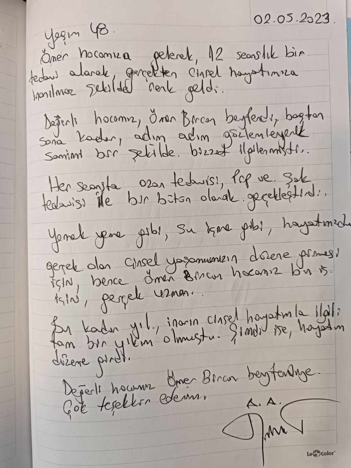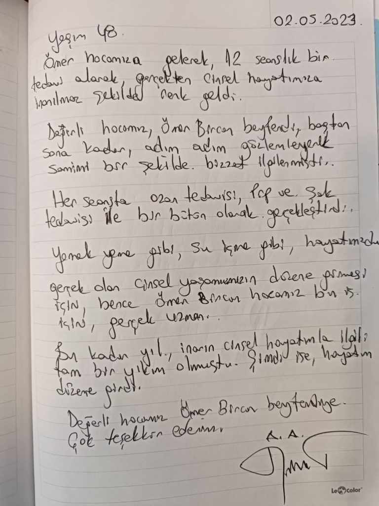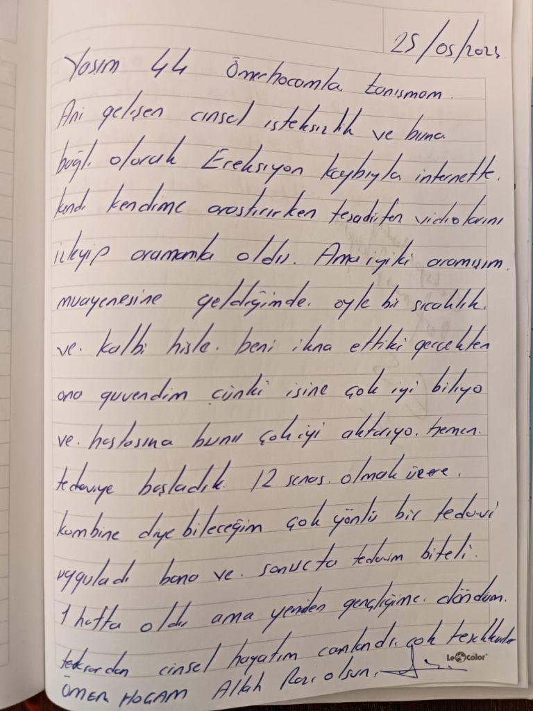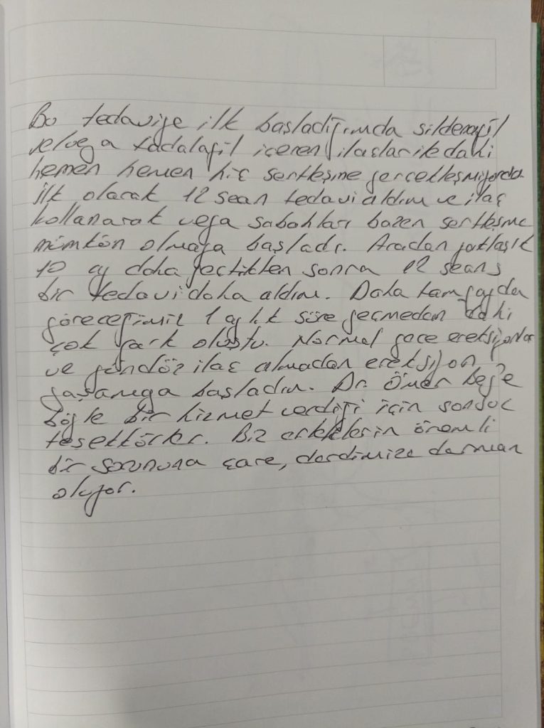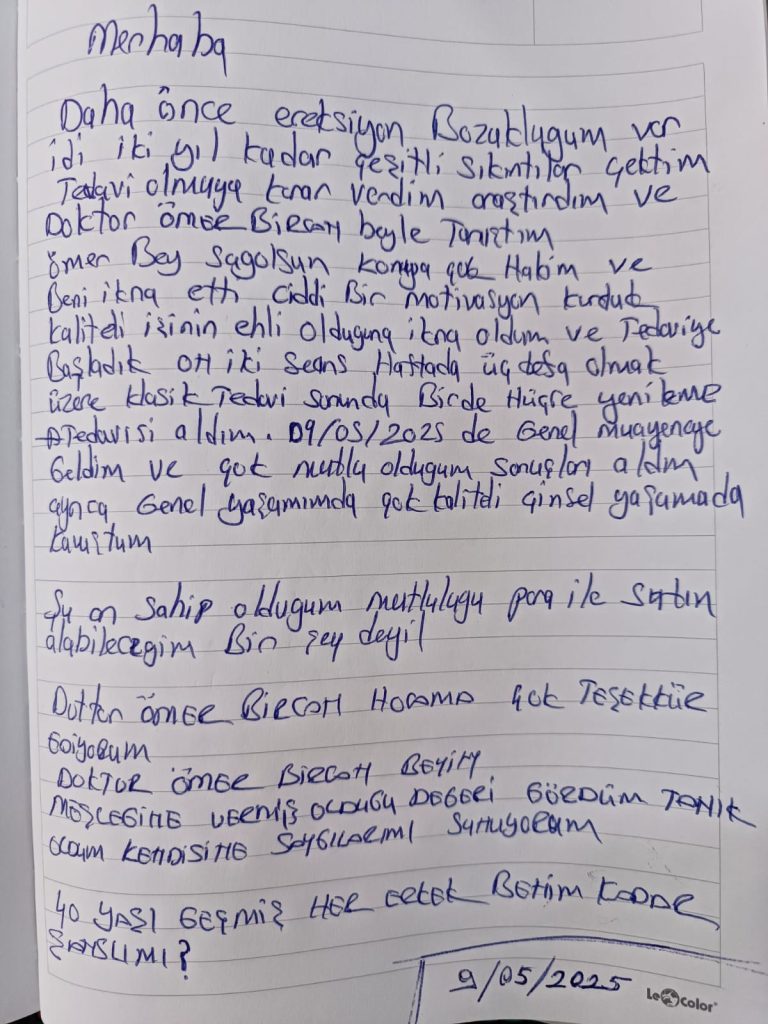 Kaliteli işinin ehli olduğuna ikna oldum ve tedaviye başladık. On iki seans haftada üç defa olmak üzere klasik tedavi sonunda birde hücre yenileme tedavisi aldım. 09/05/2025 de genel muayeneye geldim ve çok mutlu olduğum sonuçları aldım ayrıca genel yaşamımda çok kaliteli cinsel yaşamada kavuştum.