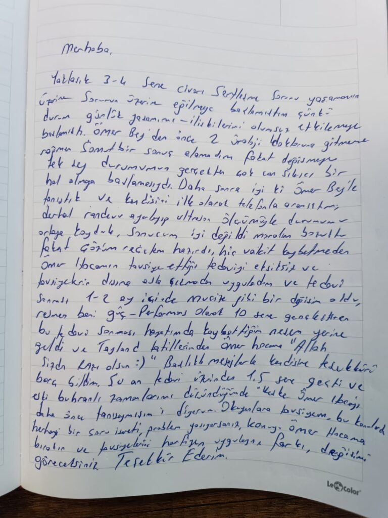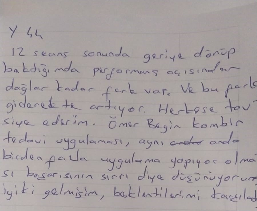 12 seans sonunda geriye dönüp baktığımda performans açısından dağlar kadar fark var. Ve bu fark giderekte artıyor. Herkese tavsiye ederim. Ömer bey’in kombin tedavi uygulaması, aynı anda birden fazla uygulama yapıyor olması başarısını sırrı diye düşünüyorum. İyi ki gelmişim beklentilerimi karşıladı.