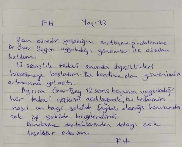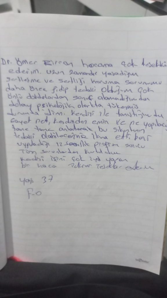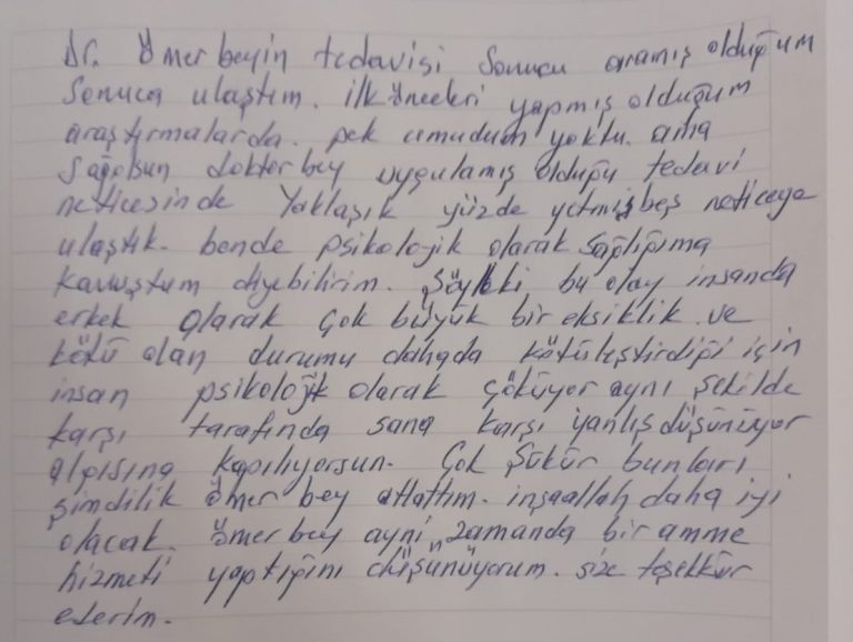 Dr. Ömer Bey’in tedavisi sonucu aramış olduğum sonuca ulaştım. İlk önceki yapmış olduğum araştırmalarda pek umudum yoktu ama sağ olsun doktor bey uygulamış olduğu tedavi neticesinde yaklaşık yüzde yetmiş beş neticeye ulaştık. Bende psikolojik olarak sağlığıma kavuştum diyebilirim. Şöyle ki bu olay insanda erkek olarak çok büyük bir eksiklik ve kötü olan durumu daha da kötüleştirdiği için insan psikolojik olarak çöküyor. Aynı şekilde karşı tarafından sana karşı yanlış düşünüyor algısına kapılıyorsun. Çok şükür bunları şimdilik Ömer Bey atlattım. İnşaallah daha iyi olacak Ömer Bey. Aynı zamanda bir amme hizmeti yaptığını düşünüyorum. Size teşekkür ederim.