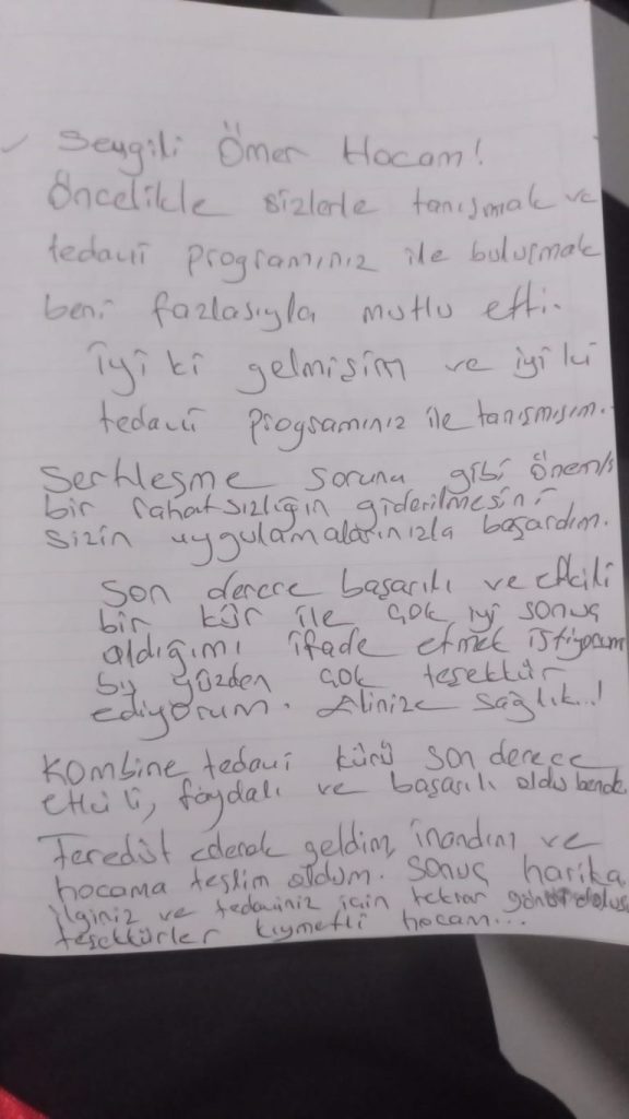 Çok teşekkür ederim hocam ilk üçüncü seansta faydasını gördüm, çokta memnun oldum. Ömer hocama teşekkür ederim. Fazlasıyla ilgilendi. Teşekkürler hocam.