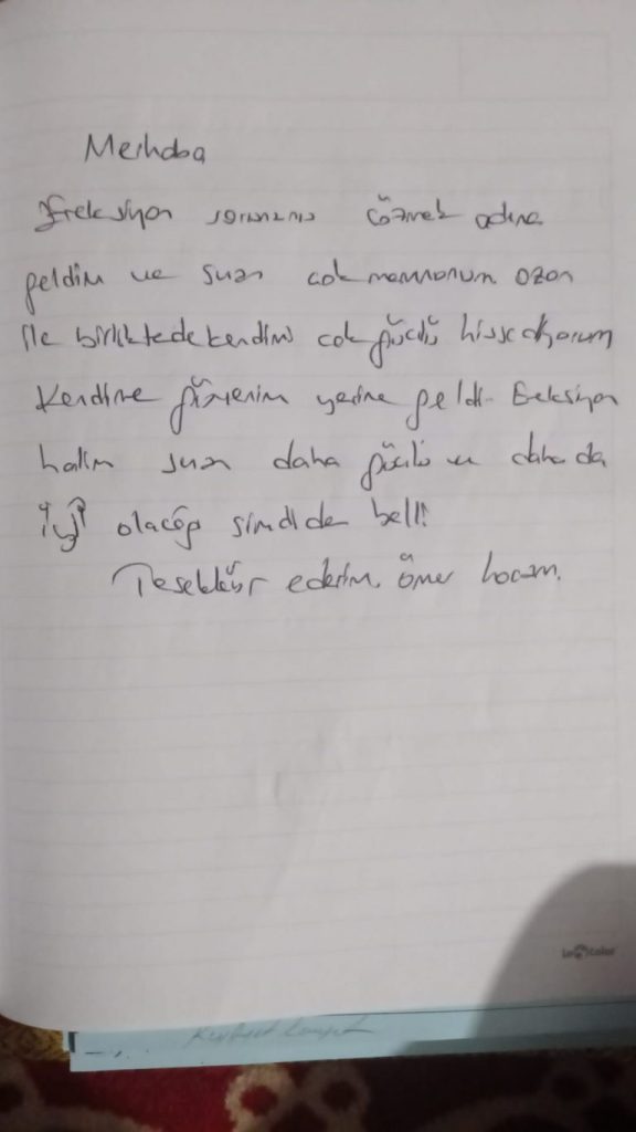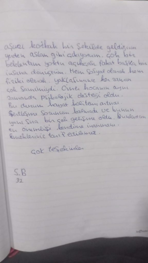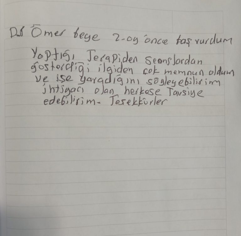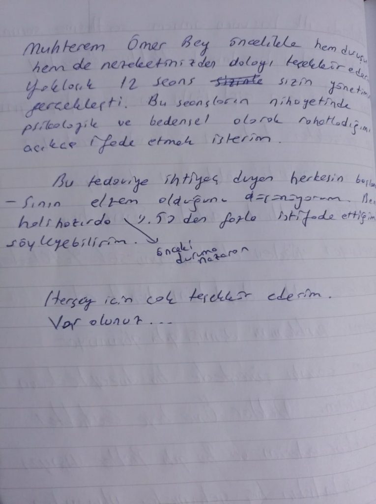 Muhterem Ömer Bey öncelikle hem duruşunuz hem de nezaketinizden dolayı teşekkür ederim. Yaklaşık 12 seans sizin yönetiminizde gerçekleşti. Bu seansların nihayetinde psikolojik ve bedensel olarak rahatladığımı açıkça ifade etmek isterim.