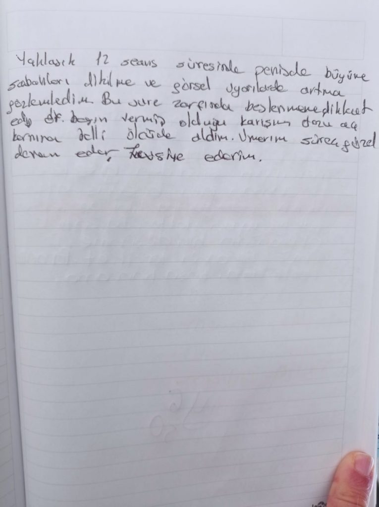 Beklentilerimin çok üzerinde bir gelişme yaşadım. Doktor beye göre bu artarak devam edecek. Sertleşme sorunum için aldığım sonuçlar hayat kalitemi yükseltti.