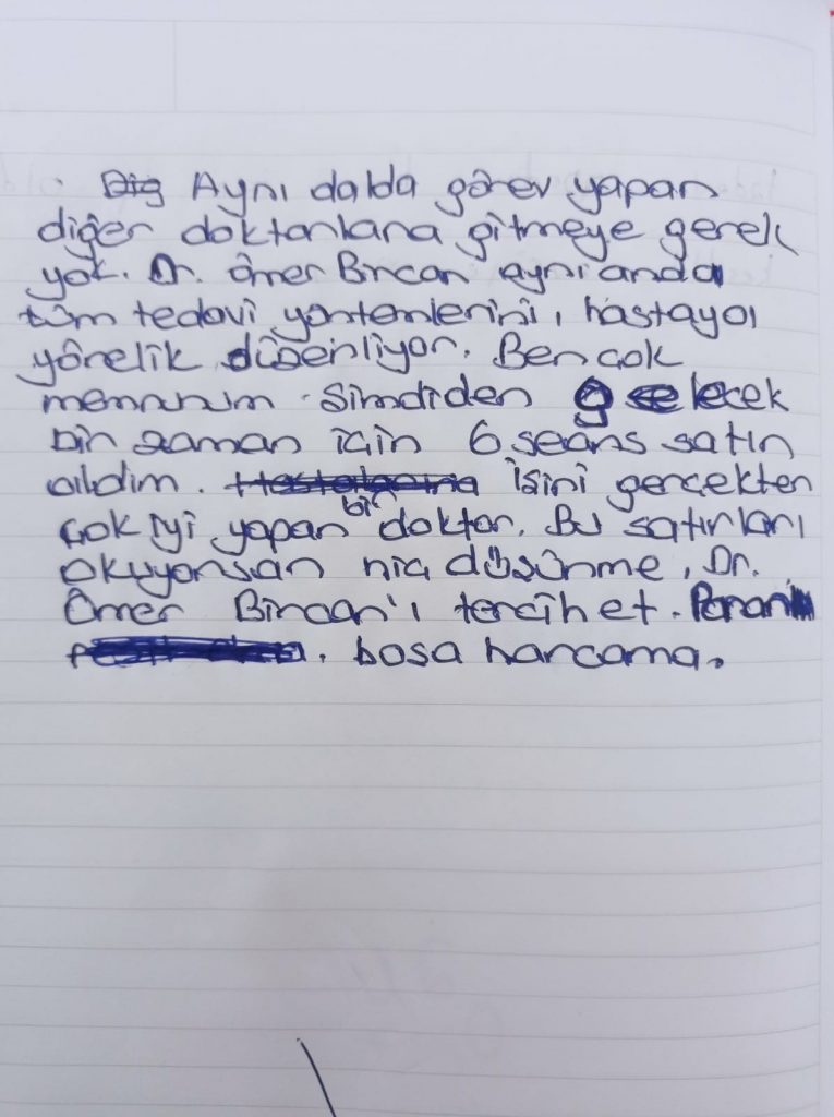 (Yurtdışından)Kısıtlı zamanda geldiğimde tedavinin yeterli olmayacağını söyleyerek daha sonraya öteledi. Amacı para değil ve sadece hastanın daha fazla fayda sağlamasını sağlayacak şekilde davranıyor.