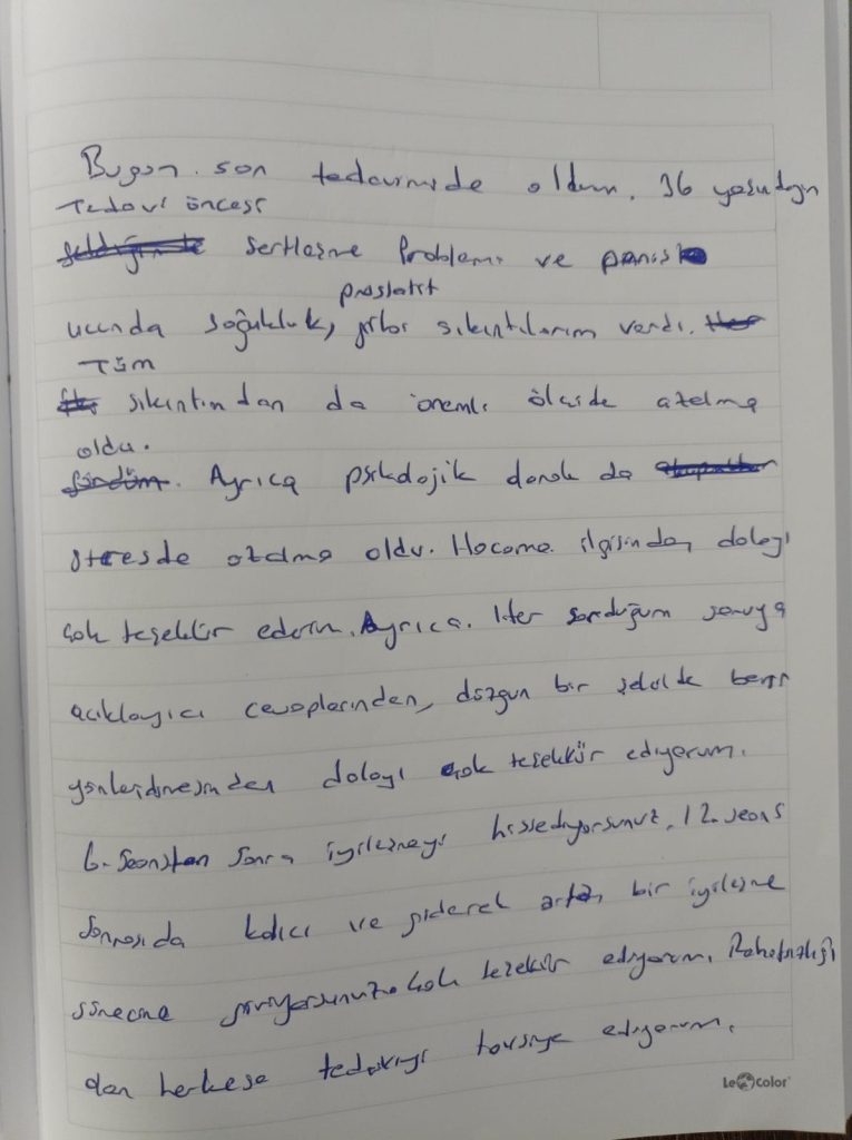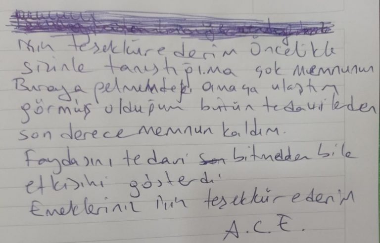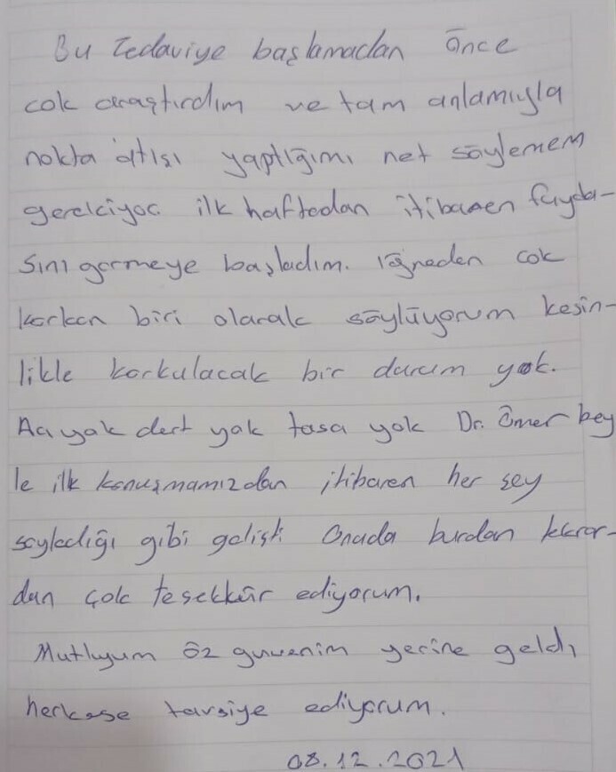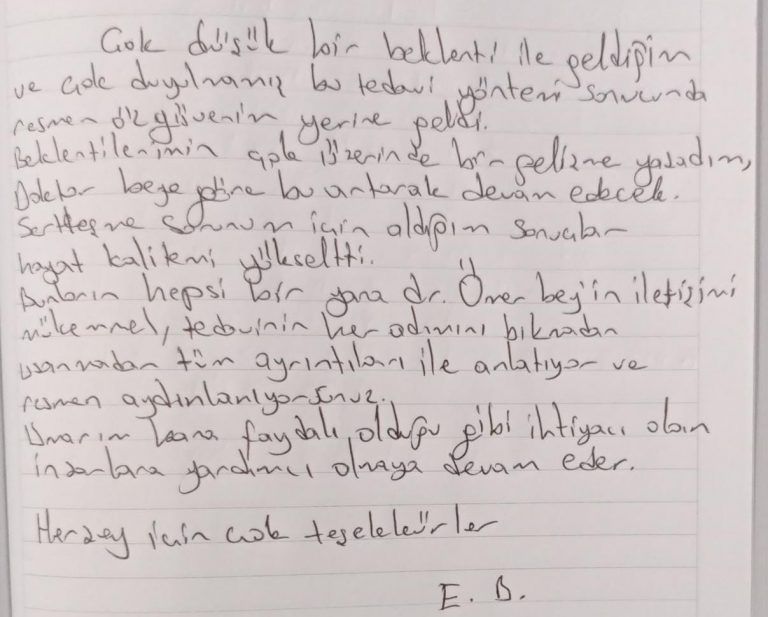 Daha sonrasında karşıma siz çıktınız. Biraz araştırıp size müracaat ettim. O gün belki de hayatım değişti. Tedavinin başlarında ister istemez kafamda soru işaretleri vardı ancak siz sürekli bir takvimden bahsettiniz. Tedavinin hangi aşamasında bizi neler beklediğini sürekli hatırlattınız. Ve süreç boyunca ne dediyseniz o çıktı. Bugün tedavimiz biteli neredeyse 1 ay oldu ve ben yaklaşık 3 haftadır inanılmaz mutluyum. Herhangi bir problemim kalmadı hatta eskisinden bile daha iyiyim.