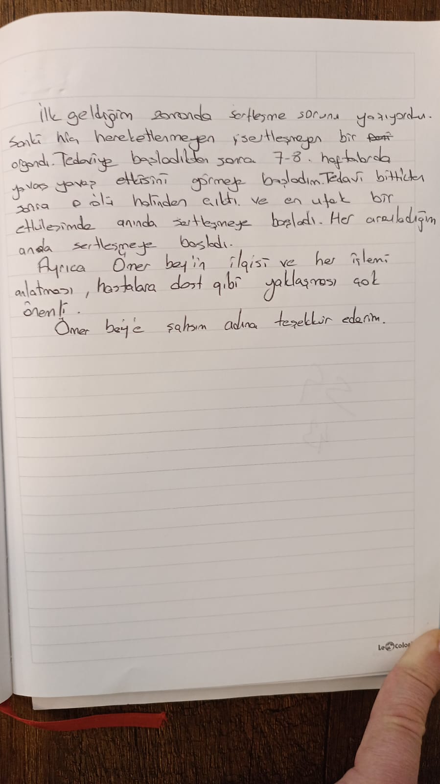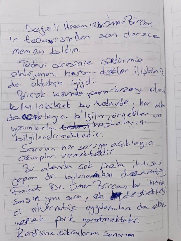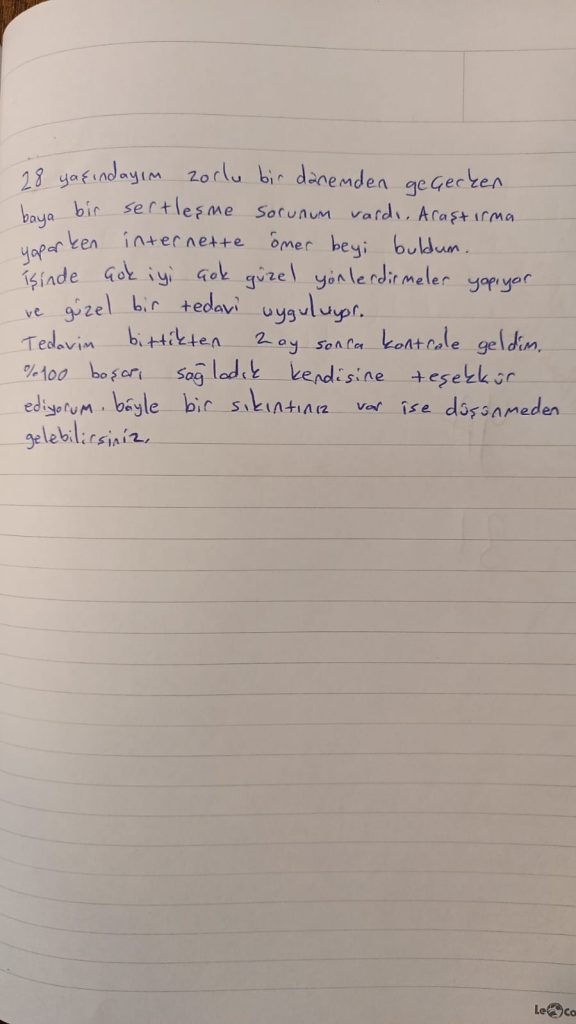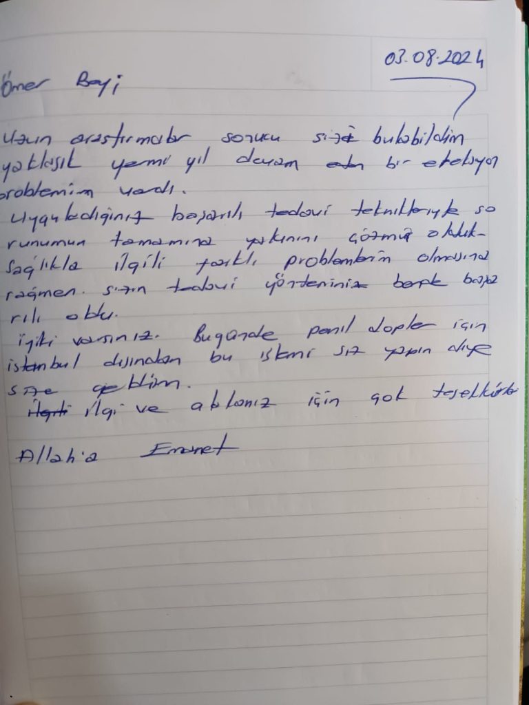 Uyguladığınız başarılı tedavi teknikleriyle sorunumun tamamına yakınını çözmüş olduk. Sağlıkla ilgili farklı problemlerimin olmasına rağmen sizin tedavi yönteminiz bende başarılı oldu.
