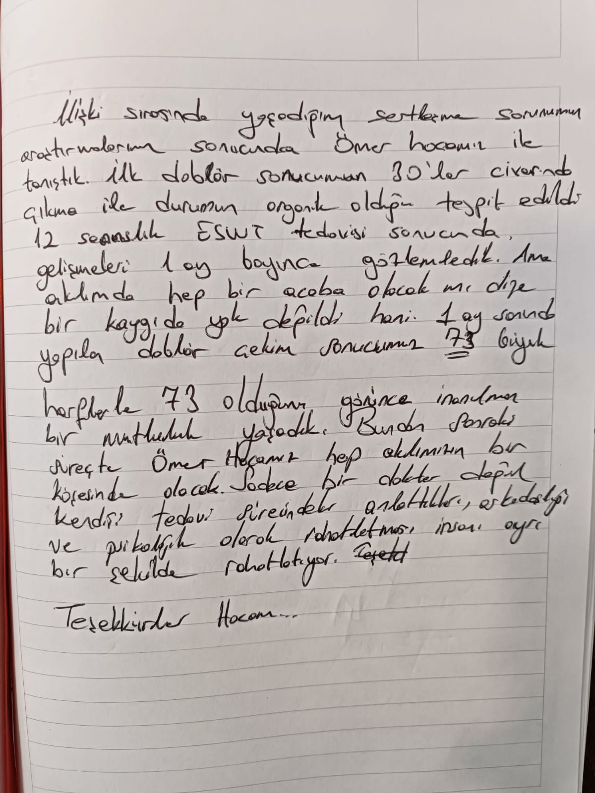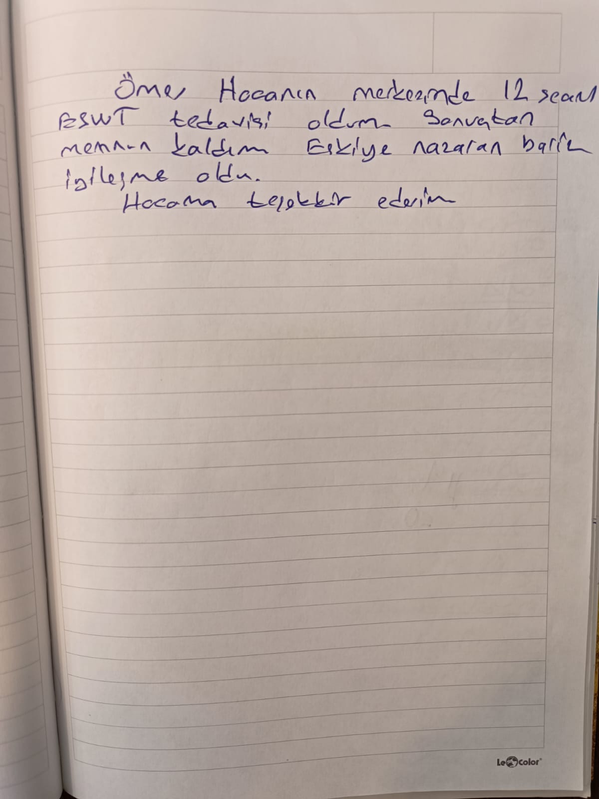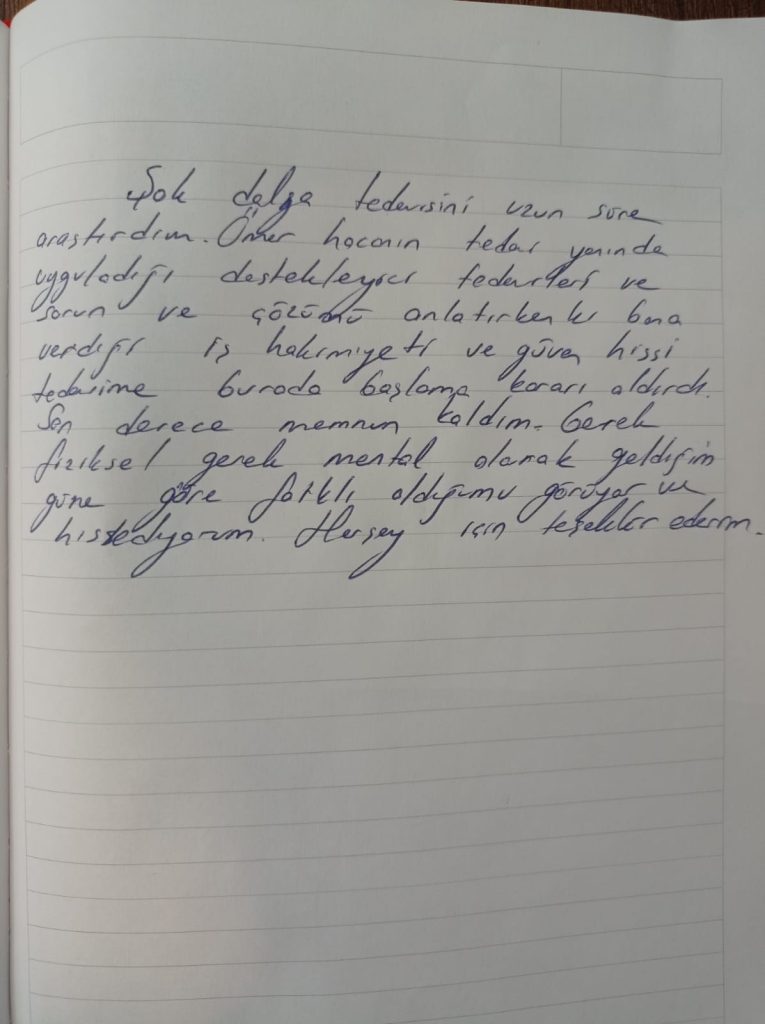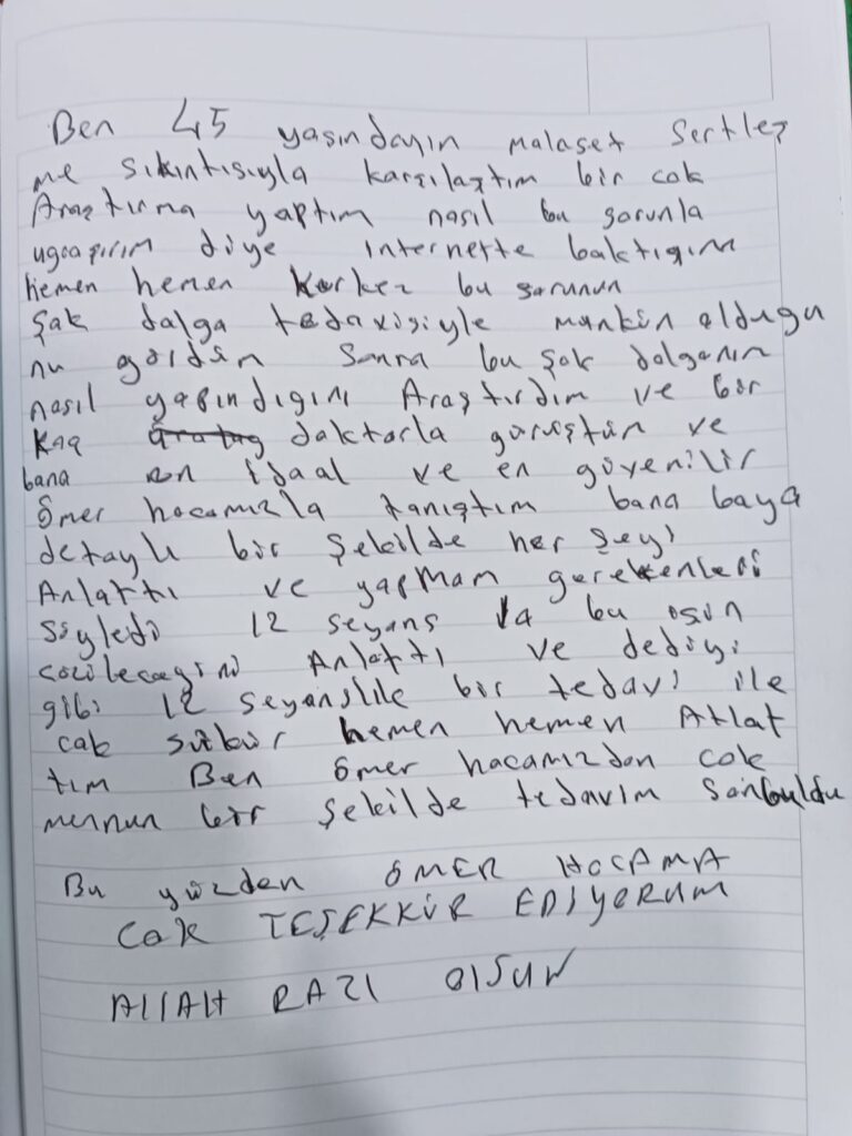 Size tedaviye gelmeden önce başka bir yerde ESWT tedavisi gördüm. Faydası olmadı. Size gelirkende faydası olacak mı diye tereddüt ederek geldim. Tedavi süresi boyunca ilgi ve alakanız her soruya sıkılmadan cevap verdiğiniz için çok teşekkür ederim. Seansların faydasını da çok şükür gördüm. Herşey için çok teşekkür ederim.