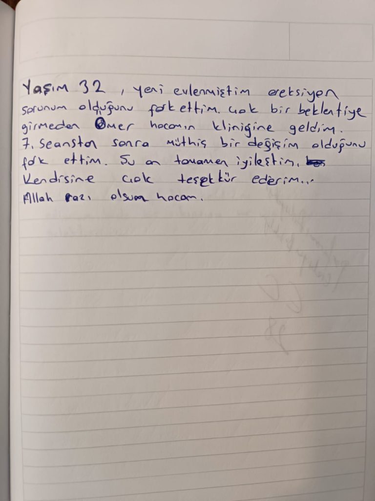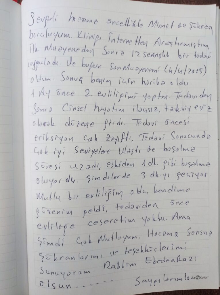 Sevgili hocama öncelikle minnet ve şükran borçluyum. Kliniği internetten araştırmıştım. İlk muayeneden sonra 12 seanslık bir tedavi uyguladı ve bugün son muayenemi (4/4/2025) oldum. Sonuç benim için harika oldu 1 ay önce 2. evliliğimi yaptım. Tedaviden sonra cinsel hayatım ilaçsız, takviyesiz olarak düzene girdi. Tedavi öncesi ereksiyon çok zayıftı. Tedavi sonucunda çok iyi seviyelere ulaştı ve boşalma süresi uzadı, eskiden 1 dk gibi boşalma oluyordu. Şimdilerde 3 dk’yı geçiyor. Mutlu bir evliliğim oldu. Kendime güvenim geldi. Tedaviden önce evliliğe cesaretim yoktu. Ama şimdi çok mutluyum. Hocama sonsuz şükranlarımı ve teşekkürlerimi sunuyorum. Rabbim ebeden razı olsun……