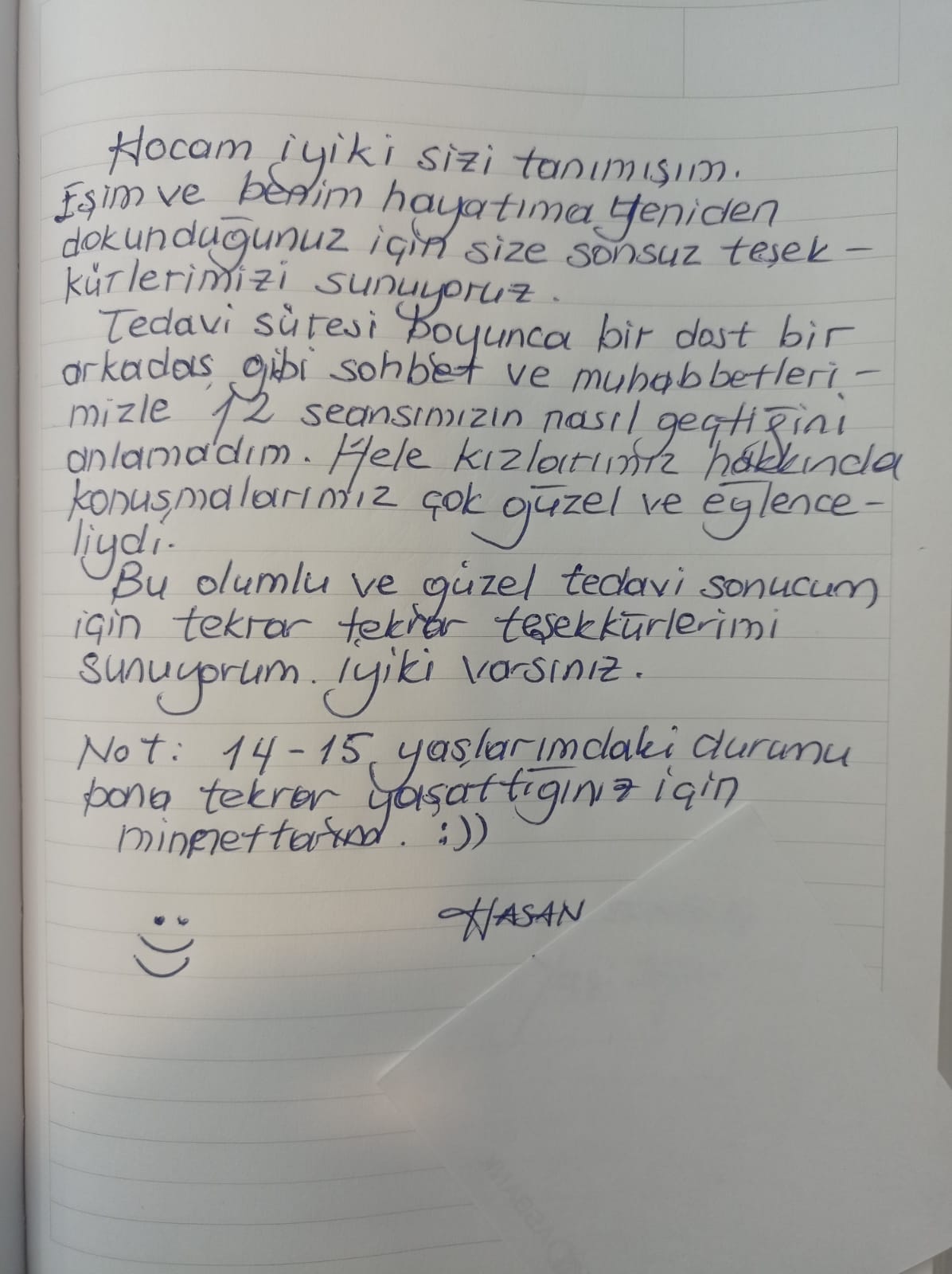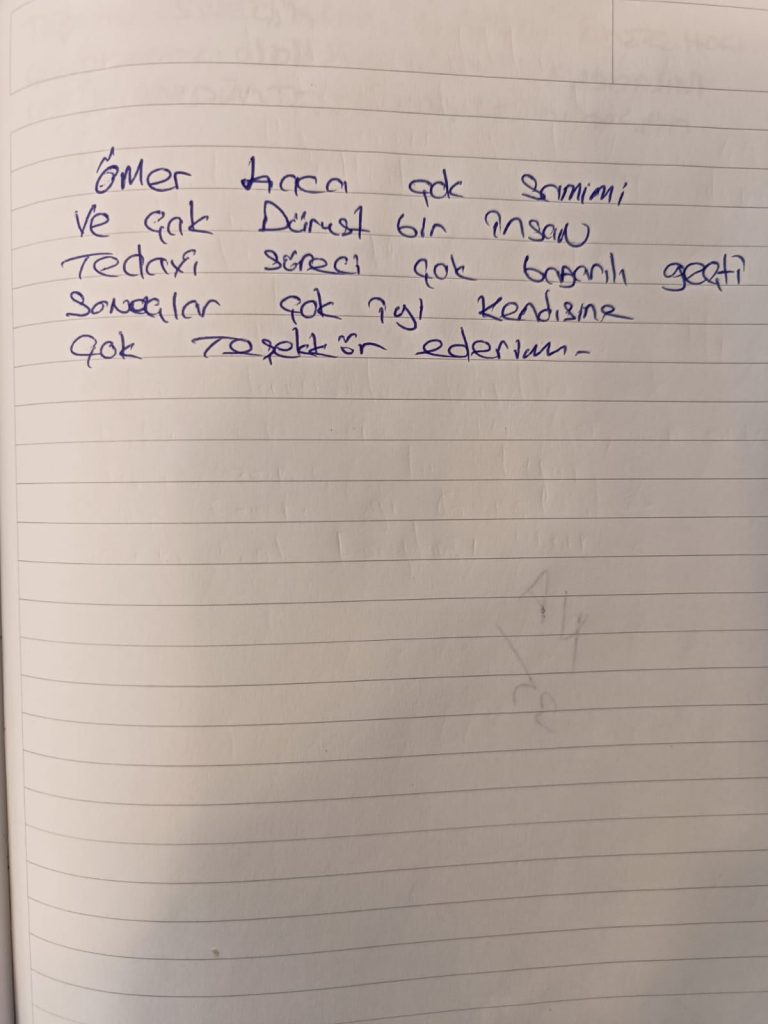 Değerli hocam, internet aracılığıyla size ulaştım iyi ki de ulaşmışım ,ilk gelirken acaba doğru yer mi tereddüt ü vardı . Ama her seansta daha da güvenim arttı ve tedavinin faydalarını gördüm . sıcak ve samimi bir ortam ve kaliteli tam bir tedavi olduğunu düşünüyorum .