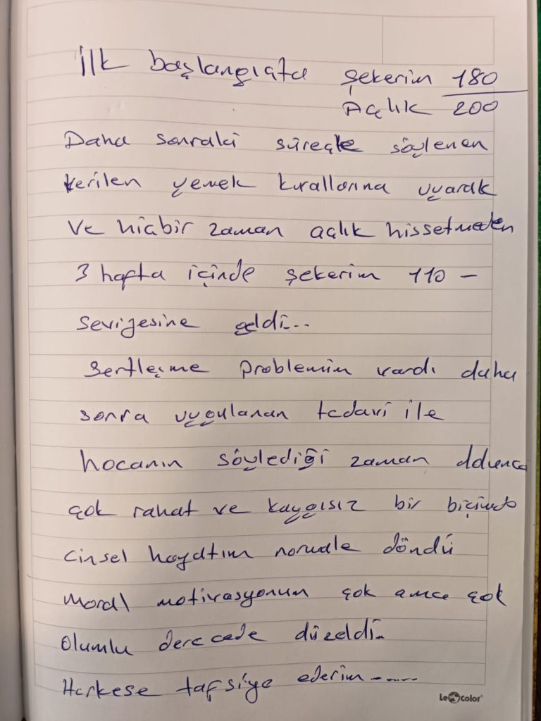 Dr. Ömer Bey’le 2024 Mayıs sonunda tanıştık. Şeker kontrolü için başvurdum. Dediklerinin tümünü yaşadım. Elektro akupunkturdan sonra canım hiçbir şey istemiyordu. Ben hiçbir ilaç kullanmadım açlık şekerim 300’den 110-120’lere düştü üç aylık oralamam HbA1C 9.14 ten 5.4’e düştü. En önemlisi sıfır ilaç. Daha sonra sertleşme sorunu ile tedaviye başladı. Bu süre içinde bana dediklerinin tamamına uydum. ilk muayenede 24 olan oran (Penil Kan Akım Hızı cm/sn Doppler değeri) tedavi sonucu 50.9 oldu. Bu süre zarfında emekleri için çok teşekkür ederim. Başarılarının artarak devamını dilerim. Her kesede tavsiye ediyorum.
