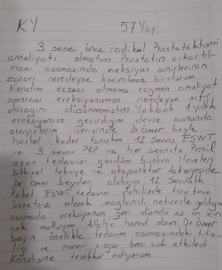 3 sene önce radikal prostatektomi ameliyatı olmuştum. Prostatın çıkartılması aşamasında ereksiyon sinirlerinin zararı nerdeyse kaçınılmaz bir durumdur. Kendim eczacı olmama rağmen ameliyat sonrası ereksiyonumun neredeyse sıfır olacağını düşünmemiştim.Yaklaşık 1 yıllık ereksiyonsuz geçirdiğim devre sonunda arayışlarım içerisinde Dr. Ömer beyle hasbel kader tanıştım. 12 seans ESWT ve 3 seans PRP ve her seansta Penil Ozon tedavisi gördüm. Bunlara ilaveten bitkisel takviye ve akapuntur takviyeside Dr. Ömer beyden aldığım 12 seanslık paket ESWT tedavisi dahilinde tarafıma ücretsiz olarak sağlandı. Neticede geldiğim aşamada ereksiyonum geri döndü, şuan için çok mutluyum Allah’a hamd olsun. Dr Ömer beyin özellikle tedavim aşamasındaki titizliği ve manevi çizgisi beni çok etkiledi. Kendisine teşekkür ediyorum.