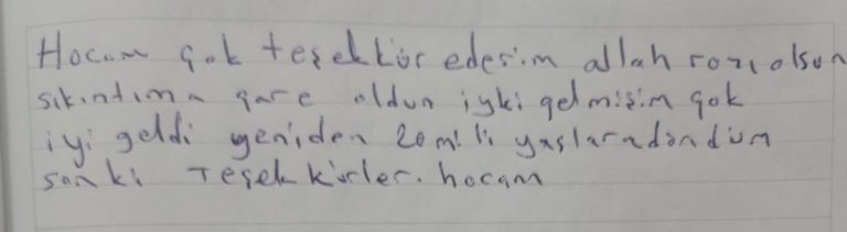Hocam çok teşekkür ederim Allah razı olsun sıkıntıma çare oldun. İyiki gelmişim çok iyi geldi. Yeniden 20li yaşlarıma döndüm sanki. Teşekkürler hocam