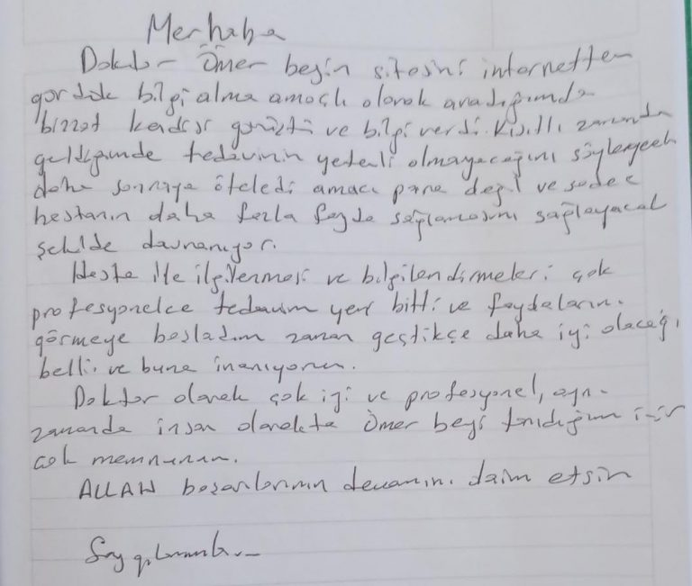 Merhaba, tedavimde gayet başarılı sonuç aldım. Bu tarz şikayetleri olan arkadaşlara, arkadaşlarıma önereceğim. Dr. Ömer Bey’e Teşekkür ederim.